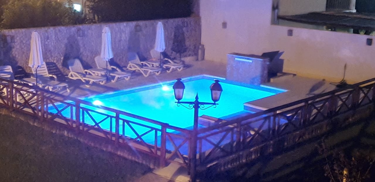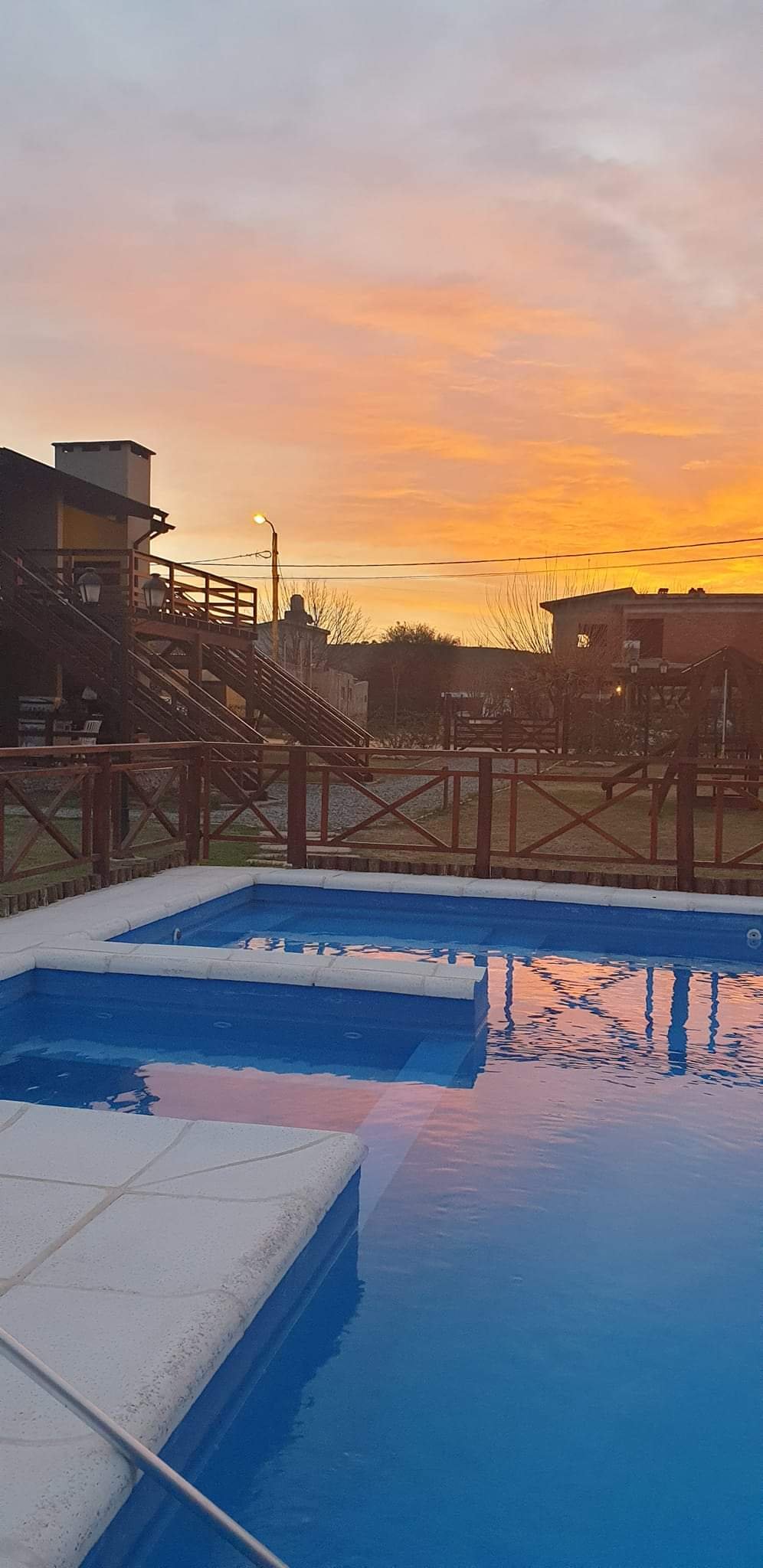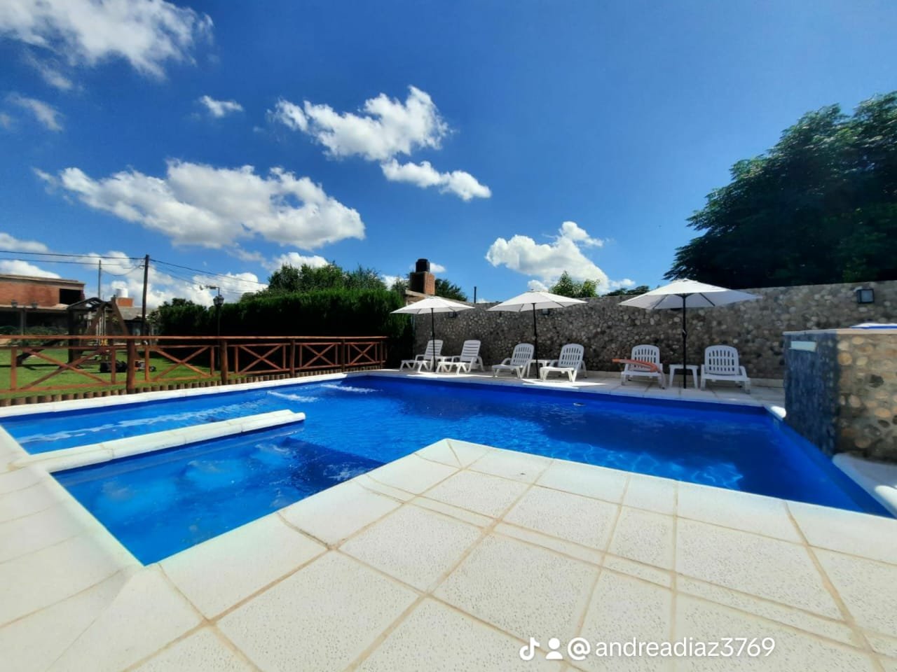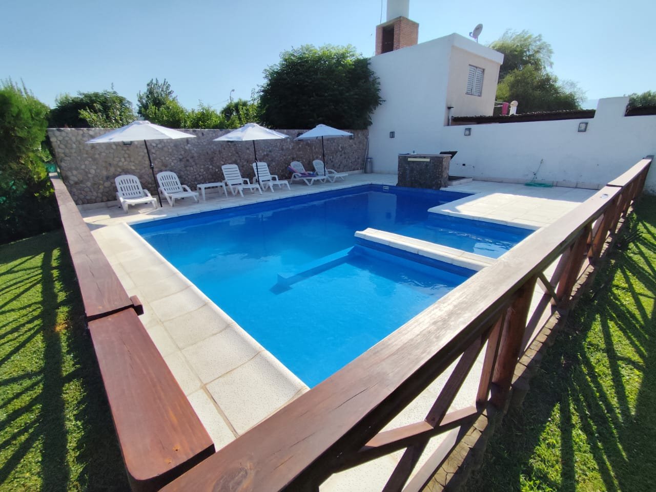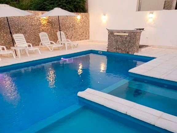 Piscina cercada con solárium, piso atérmico, cascada, jacuzzi y luces.
